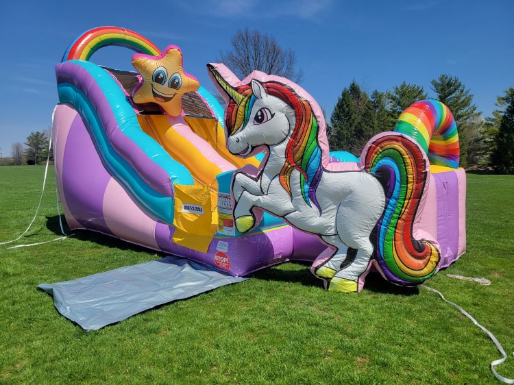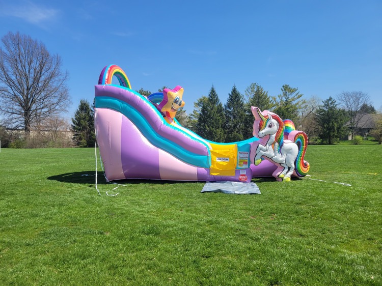 The Rainbow Unicorn slide is guaranteed to wow all princesses for their special day! With newest vinyl material and sparkles with in the material will make for stunning photos for your princesses gatherings. This slide can be wet or dry, keeping the children cool on hot Indiana days! This slide is built with sun shades and extra grip stairs allowing for climbing safety!